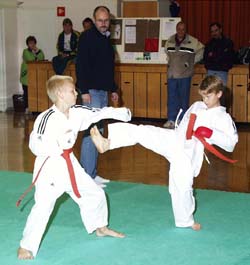 Junioreiden karateharjoitukset ovat tarkkaan rytmitetty siten, että karaten harjoittelun lomassa on pelejä ja leikkejä. Näiden avulla kehitetään niitä taitoja, kuten nopeutta, tasapainoa ja kehon hallintaa, joita kaikessa liikunnassa tarvitaan. Joukkuepelit ja leikit tekevät harjoitukset mielekkäiksi myös pienemmille harrastajille, jotka eivät jaksa keskittyä pelkkään karateen kovinkaan kauaa. Joukkuepeleissä ei myöskään kukaan koe itseään yksilönä häviäjänä.